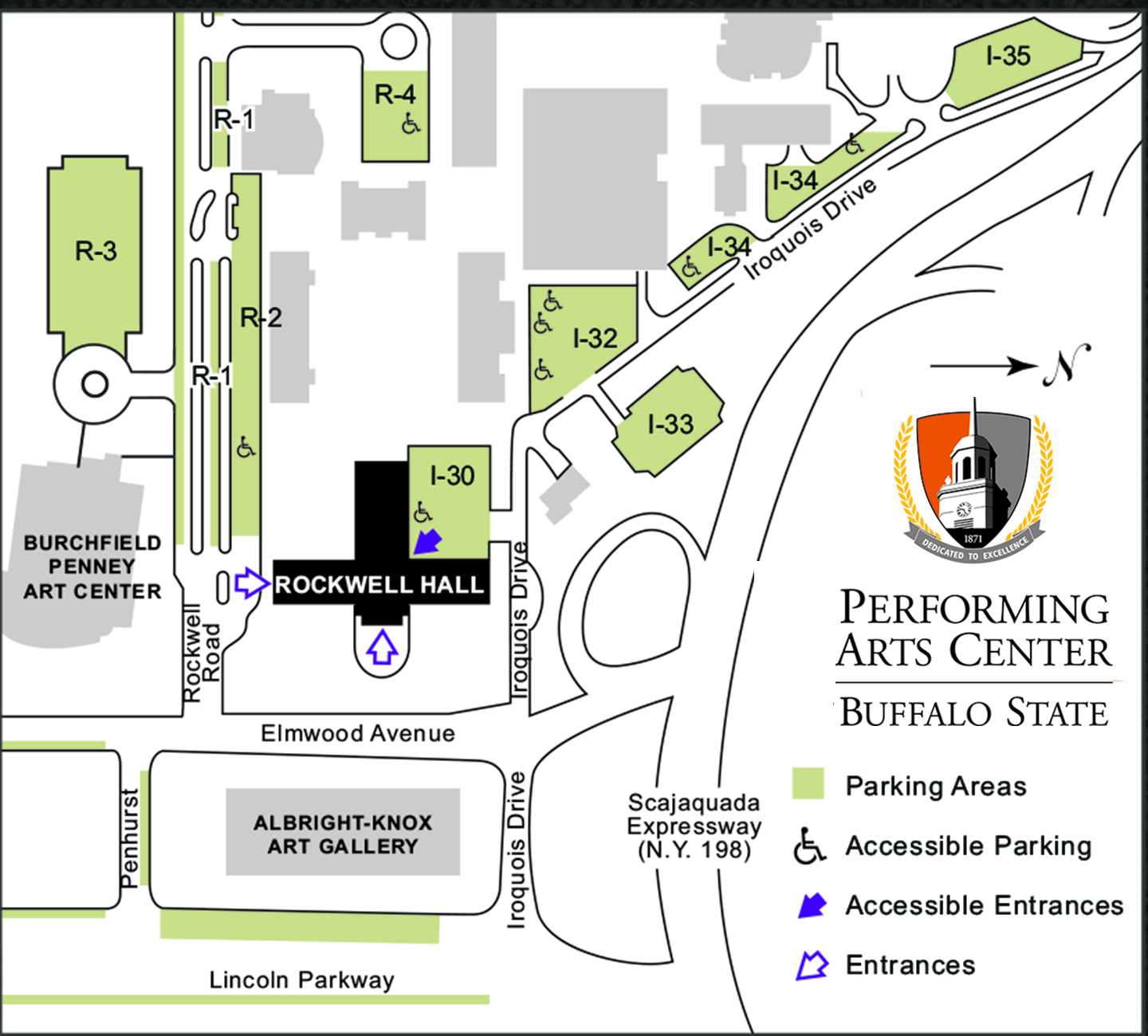 From the South and West (via the NYS Thruway/Interstate 90) From the I-90 exit onto the 190 North. Follow the 190 North to Exit 11 for the Scajaquada Expressway (198 East). Exit the 198 at Elmwood Avenue turning right towards Elmwood Avenue. Proceed straight through the light and onto campus. Rockwell Hall is the first building on campus (the one with the clock tower).